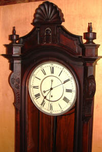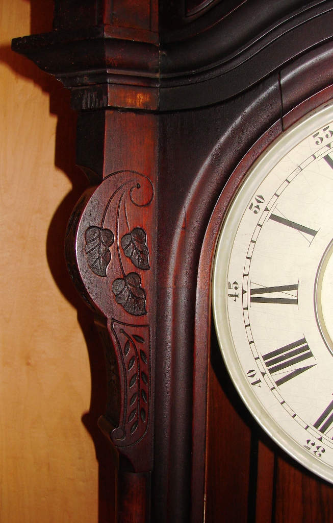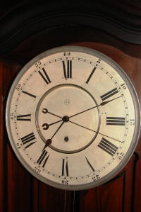 The clock measures 75” long, has nice original finish, finely engraved nickel pendulum bob, original finials and a suburb original painted dial, which is often repainted or in very poor shape for this model. Eight day movement with 12” dial and sweep seconds hand mounts to Lyre-form cast iron back plate which supports the back swinging pendulum. There are interesting horseshoe design hands. There is a chapter central ring which keeps hands from rubbing against the dial, a trait borrowed from Vienna wall regulators which indeed this case represents the best features of any Vienna regulator made in Germany but with the heavy walnut and veneers which makes our Victorian and Renaissance Revival furniture that much better than pieces shipped from overseas. Pictures will tell it all on this fine Seth Thomas regulator. E. Howard of Boston would have loved adding this model to their fine line of regulator clocks they made in the latter of half of the 19th century. Seeing this specific model clock was the choice of the Santa Fe Railway Line and present in many railway stations during the 1880’s speaks for itself as to the accuracy of this clock..