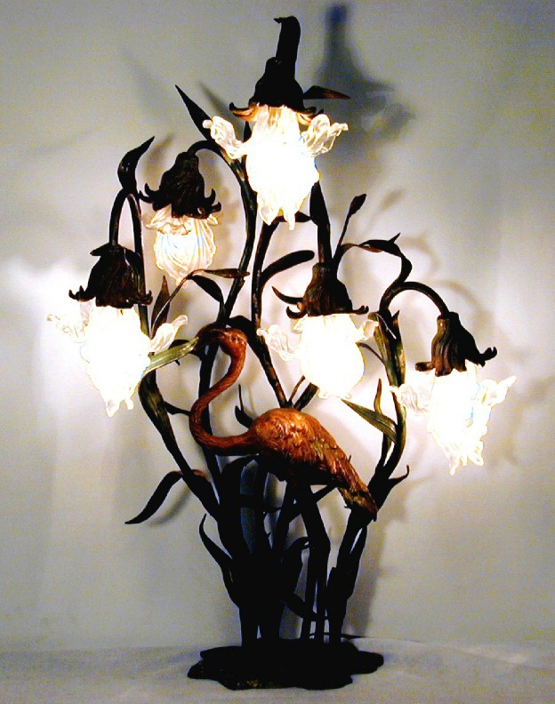 The base of the lamp depicts a flamingo, standing in an Iris patch. It is 36" tall and has no markings. Its construction is bronze, with painted accents. The frosted crystal, petal-form "prisms" when hung properly, form a beautiful, perfect hanging Iris flower. There are 6 or 7 different prism patterns, some tall, some short, some curled up and some not. Many of the petals are marked "R. LALIQUE", with a molded signature near the hole, at the top wear the wire is threaded (for hanging).
