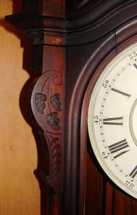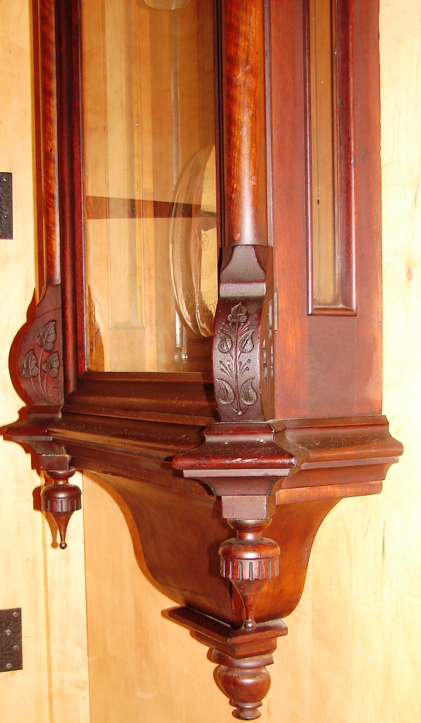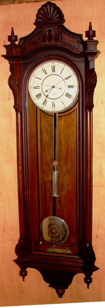 The clock measures 75” long, has nice original finish, finely engraved nickel pendulum bob, original finials and a suburb original painted dial, which is often repainted or in very poor shape for this model. Eight day movement with 12” dial and sweep seconds hand mounts to Lyre-form cast iron back plate which supports the back swinging pendulum. There are interesting horseshoe design hands. There is a chapter central ring which keeps hands from rubbing against the dial, a trait borrowed from Vienna wall regulators which indeed this case represents the best features of any Vienna regulator made in Germany but with the heavy walnut and veneers which makes our Victorian and Renaissance Revival furniture that much better than pieces shipped from overseas. Pictures will tell it all on this fine Seth Thomas regulator. E. Howard of Boston would have loved adding this model to their fine line of regulator clocks they made in the latter of half of the 19th century. Seeing this specific model clock was the choice of the Santa Fe Railway Line and present in many railway stations during the 1880’s speaks for itself as to the accuracy of this clock..