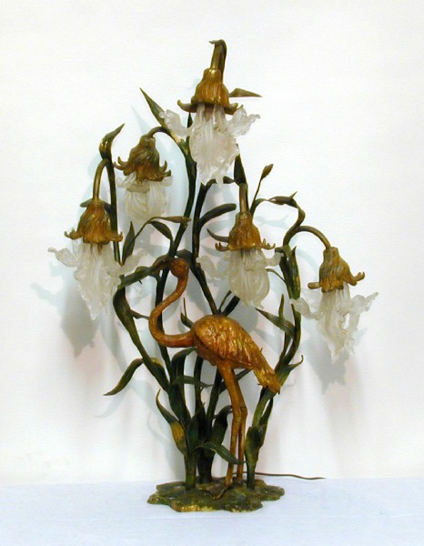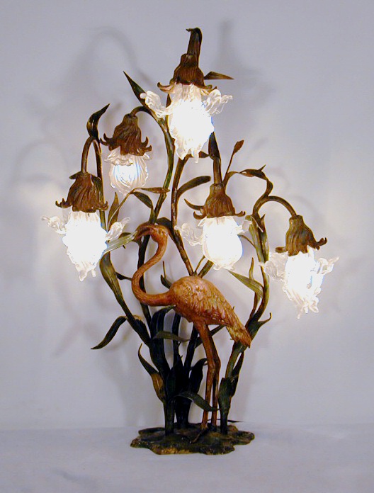IMPORTANT COLD PAINTED BRONZE FLAMINGO LAMP WITH LALIQUE PRISMS