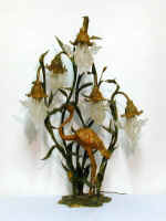 The base of the lamp depicts a flamingo, standing in an Iris patch. It is 36" tall and has no markings. Its construction is bronze, with painted accents. The frosted crystal, petal-form "prisms" when hung properly, form a beautiful, perfect hanging Iris flower. There are 6 or 7 different prism patterns, some tall, some short, some curled up and some not. Many of the petals are marked "R. LALIQUE", with a molded signature near the hole, at the top wear the wire is threaded (for hanging).